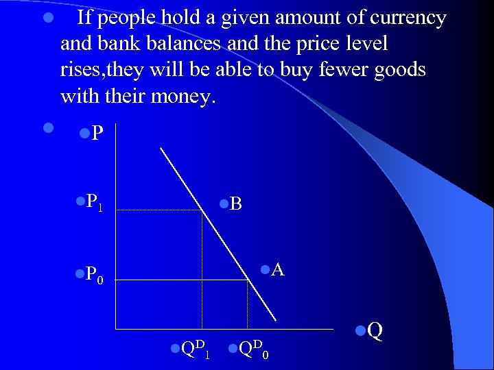 l l If people hold a given amount of currency and bank balances and the price level rises, they will be able to buy fewer goods with their money. l. P l P 1 l. B l. A l P 0 l Q D 1 l Q D 0 l. Q