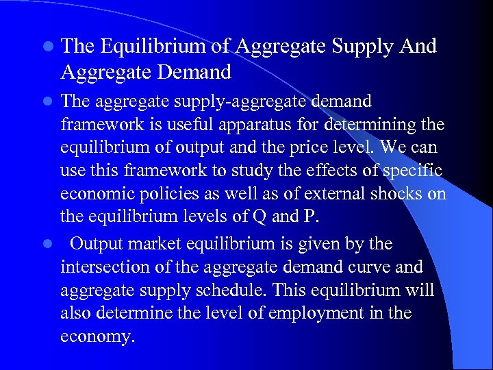 l The Equilibrium of Aggregate Supply And Aggregate Demand The aggregate supply-aggregate demand framework is useful apparatus for determining the equilibrium of output and the price level. We can use this framework to study the effects of specific economic policies as well as of external shocks on the equilibrium levels of Q and P. l Output market equilibrium is given by the intersection of the aggregate demand curve and aggregate supply schedule. This equilibrium will also determine the level of employment in the economy. l