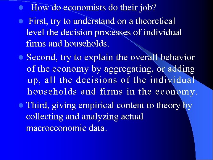 How do economists do their job? l First, try to understand on a theoretical level the decision processes of individual firms and households. l Second, try to explain the overall behavior of the economy by aggregating, or adding up, all the decisions of the individual households and firms in the economy. l Third, giving empirical content to theory by collecting and analyzing actual macroeconomic data. l