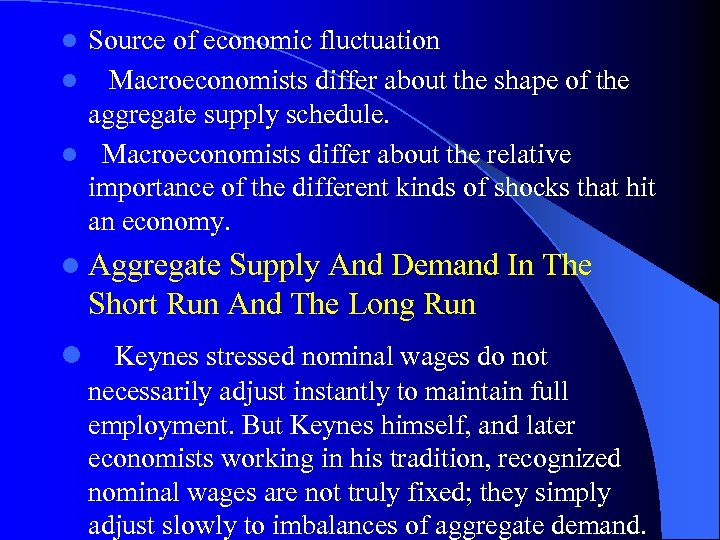 Source of economic fluctuation l Macroeconomists differ about the shape of the aggregate supply schedule. l Macroeconomists differ about the relative importance of the different kinds of shocks that hit an economy. l l Aggregate Supply And Demand In The Short Run And The Long Run l Keynes stressed nominal wages do not necessarily adjust instantly to maintain full employment. But Keynes himself, and later economists working in his tradition, recognized nominal wages are not truly fixed; they simply adjust slowly to imbalances of aggregate demand.