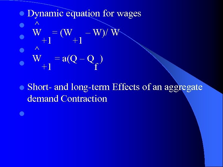 l Dynamic equation for wages l ^ W = (W – W)/ W l +1 +1 ^ W = a(Q – Q ) l +1 f l l l Short- and long-term Effects of an aggregate demand Contraction
