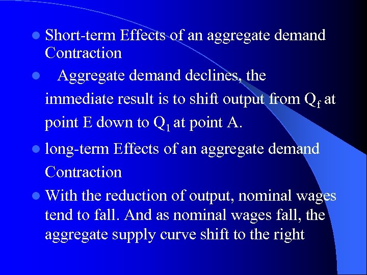l Short-term Effects of an aggregate demand Contraction l Aggregate demand declines, the immediate result is to shift output from Qf at point E down to Q 1 at point A. l long-term Effects of an aggregate demand Contraction l With the reduction of output, nominal wages tend to fall. And as nominal wages fall, the aggregate supply curve shift to the right