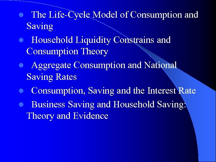 The Life-Cycle Model of Consumption and Saving l Household Liquidity Constrains and Consumption Theory l Aggregate Consumption and National Saving Rates l Consumption, Saving and the Interest Rate l Business Saving and Household Saving: Theory and Evidence l
