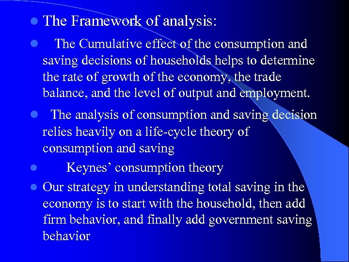 l The l Framework of analysis: The Cumulative effect of the consumption and saving decisions of households helps to determine the rate of growth of the economy, the trade balance, and the level of output and employment. l The analysis of consumption and saving decision relies heavily on a life-cycle theory of consumption and saving l Keynes’ consumption theory l Our strategy in understanding total saving in the economy is to start with the household, then add firm behavior, and finally add government saving behavior