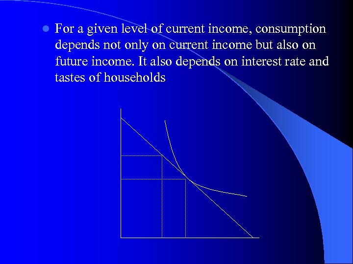 l For a given level of current income, consumption depends not only on current income but also on future income. It also depends on interest rate and tastes of households
