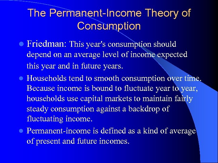 The Permanent-Income Theory of Consumption l Friedman: This year's consumption should depend on an average level of income expected this year and in future years. l Households tend to smooth consumption over time. Because income is bound to fluctuate year to year, households use capital markets to maintain fairly steady consumption against a backdrop of fluctuating income. l Permanent-income is defined as a kind of average of present and future incomes.