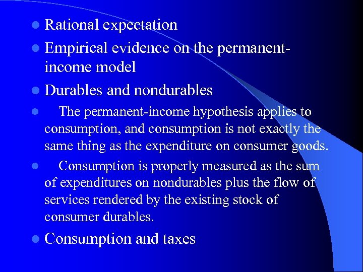 l Rational expectation l Empirical evidence on the permanentincome model l Durables and nondurables The permanent-income hypothesis applies to consumption, and consumption is not exactly the same thing as the expenditure on consumer goods. l Consumption is properly measured as the sum of expenditures on nondurables plus the flow of services rendered by the existing stock of consumer durables. l l Consumption and taxes