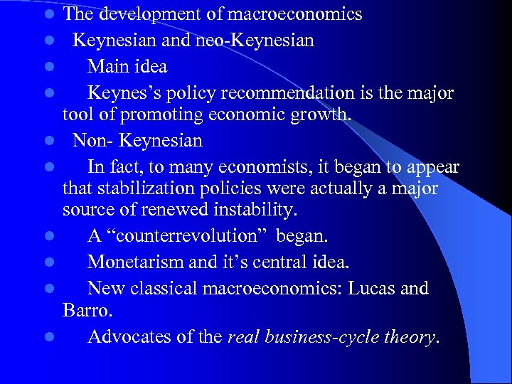 l l l l l The development of macroeconomics Keynesian and neo-Keynesian Main idea Keynes’s policy recommendation is the major tool of promoting economic growth. Non- Keynesian In fact, to many economists, it began to appear that stabilization policies were actually a major source of renewed instability. A “counterrevolution” began. Monetarism and it’s central idea. New classical macroeconomics: Lucas and Barro. Advocates of the real business-cycle theory.