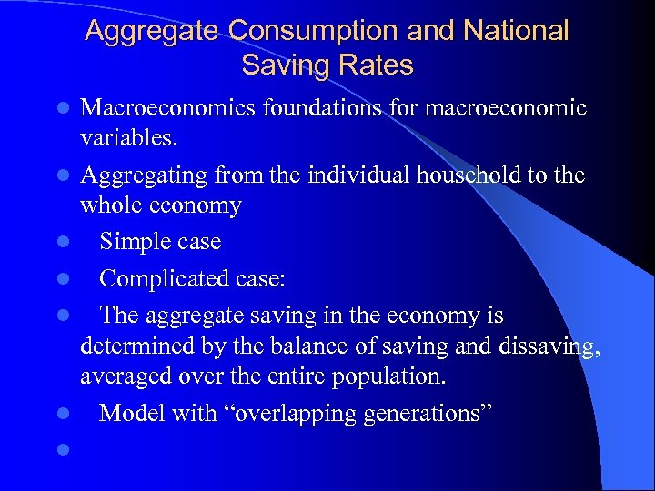 Aggregate Consumption and National Saving Rates l l l l Macroeconomics foundations for macroeconomic variables. Aggregating from the individual household to the whole economy Simple case Complicated case: The aggregate saving in the economy is determined by the balance of saving and dissaving, averaged over the entire population. Model with “overlapping generations”
