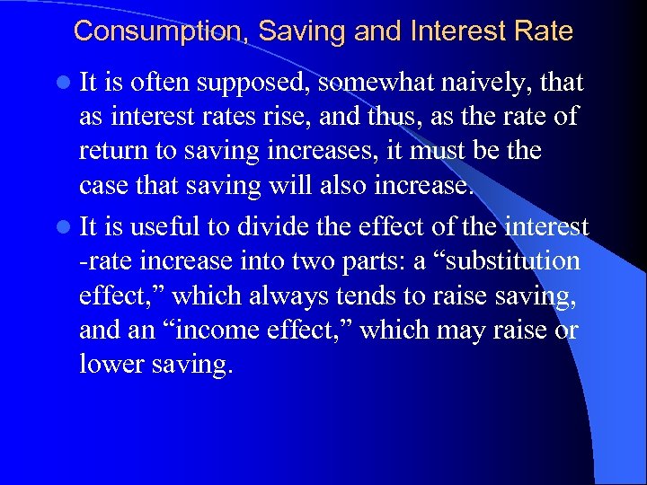 Consumption, Saving and Interest Rate l It is often supposed, somewhat naively, that as interest rates rise, and thus, as the rate of return to saving increases, it must be the case that saving will also increase. l It is useful to divide the effect of the interest -rate increase into two parts: a “substitution effect, ” which always tends to raise saving, and an “income effect, ” which may raise or lower saving.
