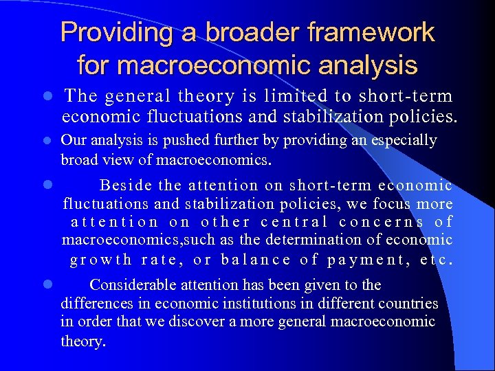 Providing a broader framework for macroeconomic analysis l The general theory is limited to short-term economic fluctuations and stabilization policies. l Our analysis is pushed further by providing an especially broad view of macroeconomics. l Beside the attention on short-term economic fluctuations and stabilization policies, we focus more attention on other central concerns of macroeconomics, such as the determination of economic growth rate, or balance of payment, etc. l Considerable attention has been given to the differences in economic institutions in different countries in order that we discover a more general macroeconomic theory.