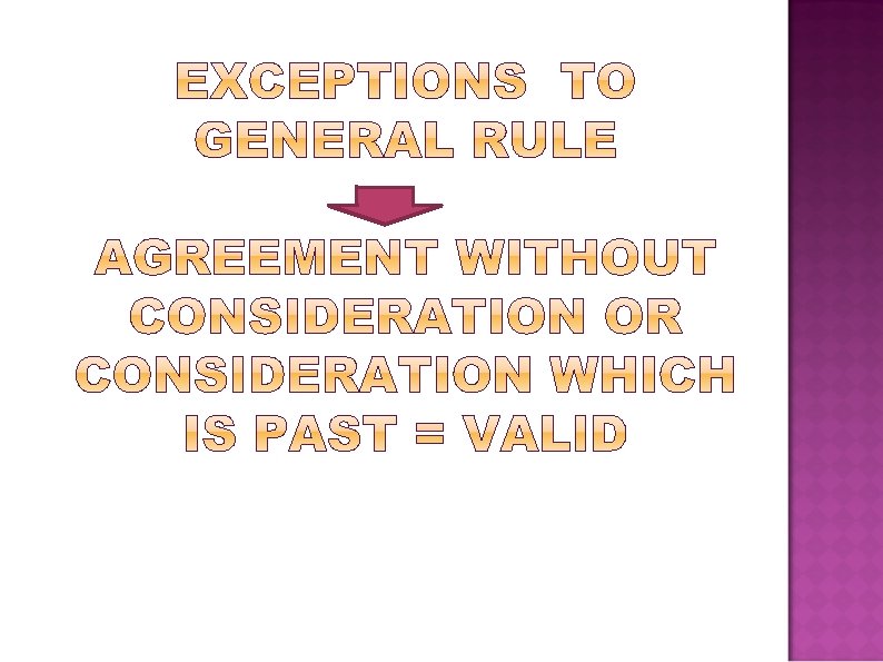 CONSIDERATION By the end of this chapter, the student should be able to: - Define consideration; - Identify when consideration is present; - Explain and apply the legal principles relating to consideration; - Explain the distinction between executory, executed and past consideration;