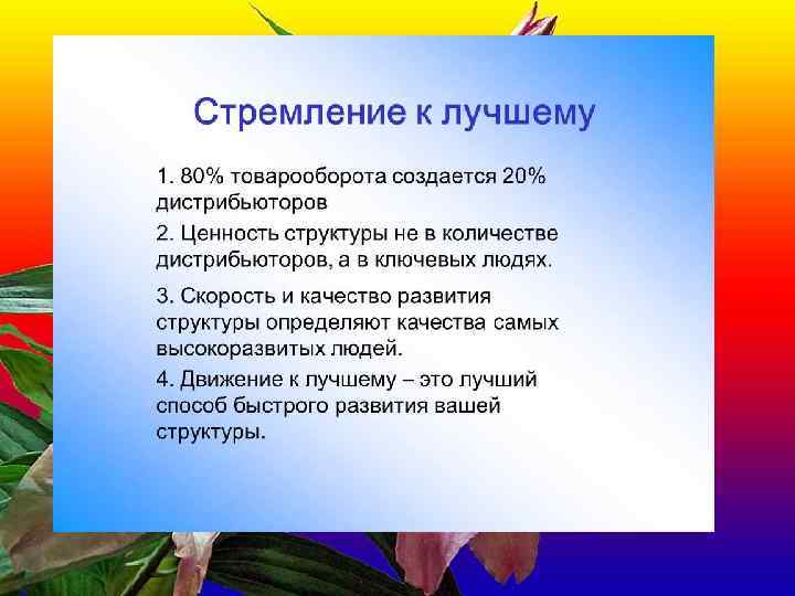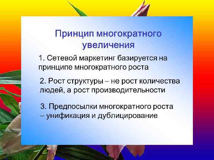 Основа сетевого бизнеса • Есть продукт, который реально востребован и конкурентоспособен • Есть бизнес-система, позволяющая абсолютно любому человеку прийти в бизнес и уже через короткое время зарабатывать те деньги, которые ему ни одна организация за такой срок гарантировать не может • Есть система обучения, направленная на рост новичка, который, падая в общий котел, приобретает температуру котла