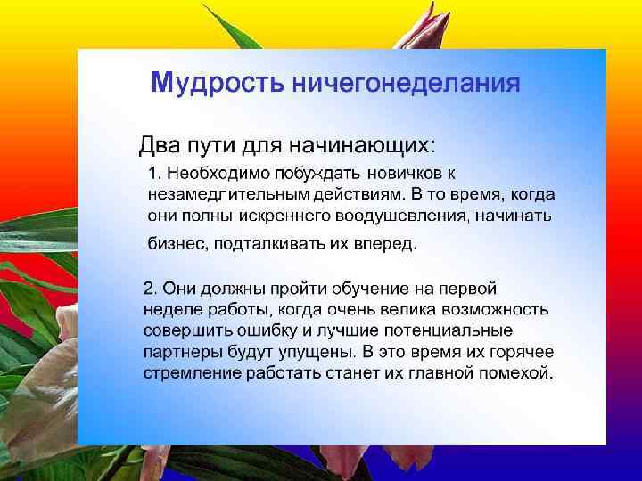5 практических действий ежедневно 3) Конкуренты Моделирование 4) Анализ своей работы – Ежедневно просматривайте, что вы сделали и какие действия принесли результат 5) Учиться ( новичку не менее 2 часов в день) ( не учиться 555 раз составлять список и не искать программы для рассылки спама) Вода в бак Отмечаем плюсами выполненные действия