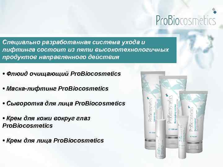 Специально разработанная система ухода и лифтинга состоит из пяти высокотехнологичных продуктов направленного действия • Флюид очищающий Рro. Biocosmetics • Маска-лифтинг Рro. Biocosmetics • Сыворотка для лица Рro. Biocosmetics • Крем для кожи вокруг глаз Рro. Biocosmetics • Крем для лица Рro. Biocosmetics