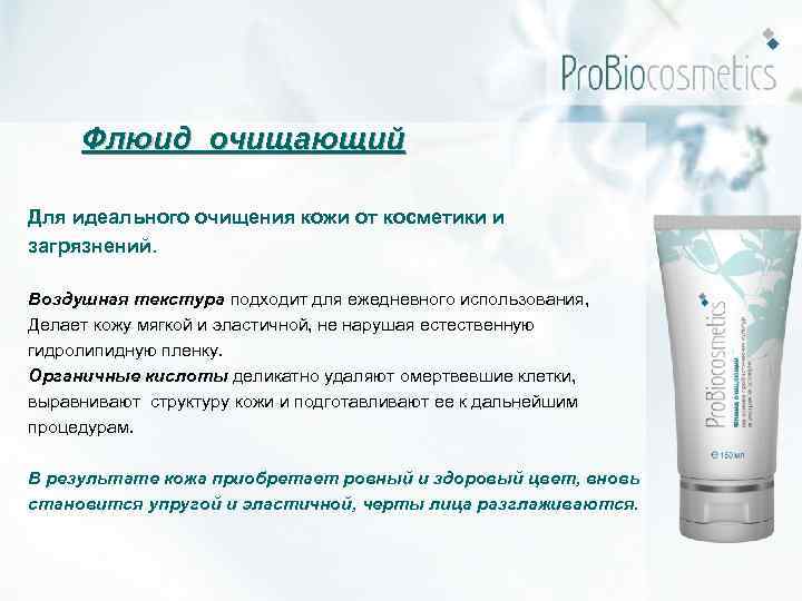 Флюид очищающий Для идеального очищения кожи от косметики и загрязнений. Воздушная текстура подходит для ежедневного использования, Делает кожу мягкой и эластичной, не нарушая естественную гидролипидную пленку. Органичные кислоты деликатно удаляют омертвевшие клетки, выравнивают структуру кожи и подготавливают ее к дальнейшим процедурам. В результате кожа приобретает ровный и здоровый цвет, вновь становится упругой и эластичной, черты лица разглаживаются.