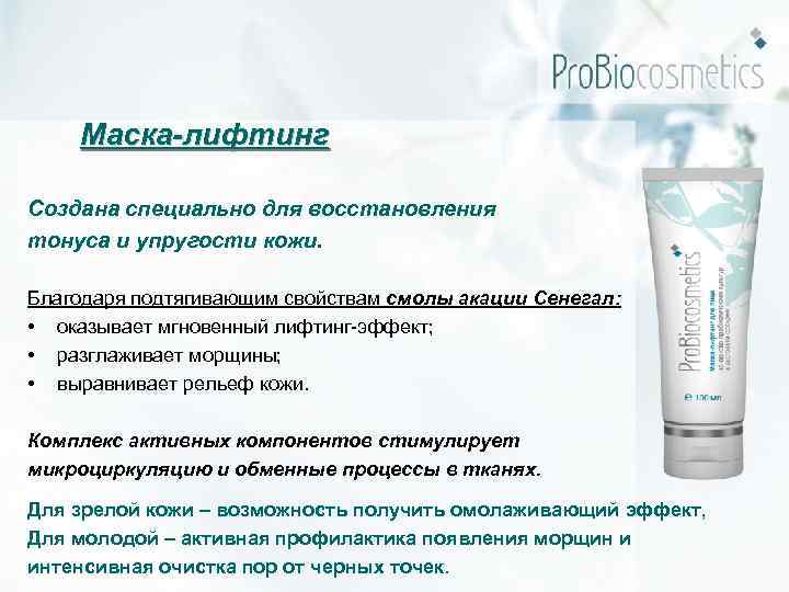 Маска-лифтинг Смягчающие и увлажняющие свойства Маски-лифтинга PROBIOCOSMETICS уже после первого применения воссоздают на коже бархатистость цветов орхидеи — улучшается цвет лица и структура кожи. Кожа заметно подтягивается, становится упругой, красота её мягко подчёркивается. Мелкие морщинки исчезают, глубокие морщины сглаживаются, овал лица становится более чётким, тёмные круги и отёки вокруг глаз сглаживаются. Лицо заметно молодеет.