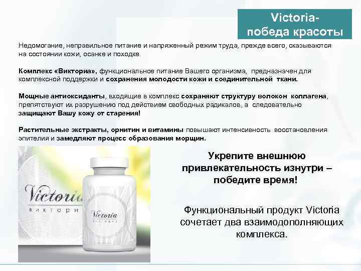Victoriaпобеда красоты Недомогание, неправильное питание и напряженный режим труда, прежде всего, сказываются на состоянии кожи, осанке и походке. Комплекс «Викториа» , функциональное питание Вашего организма, предназначен для комплексной поддержки и сохранения молодости кожи и соединительной ткани. Мощные антиоксиданты, входящие в комплекс сохраняют структуру волокон коллагена, препятствуют их разрушению под действием свободных радикалов, а следовательно защищают Вашу кожу от старения! Растительные экстракты, орнитин и витамины повышают интенсивность восстановления эпителия и замедляют процесс образования морщин. Укрепите внешнюю привлекательность изнутри – победите время! Функциональный продукт Victoria сочетает два взаимодополняющих комплекса.