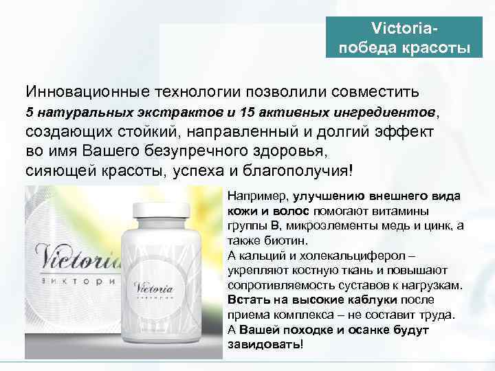 Victoriaпобеда красоты Инновационные технологии позволили совместить 5 натуральных экстрактов и 15 активных ингредиентов, создающих стойкий, направленный и долгий эффект во имя Вашего безупречного здоровья, сияющей красоты, успеха и благополучия! Например, улучшению внешнего вида кожи и волос помогают витамины группы В, микроэлементы медь и цинк, а также биотин. А кальций и холекальциферол – укрепляют костную ткань и повышают сопротивляемость суставов к нагрузкам. Встать на высокие каблуки после приема комплекса – не составит труда. А Вашей походке и осанке будут завидовать!