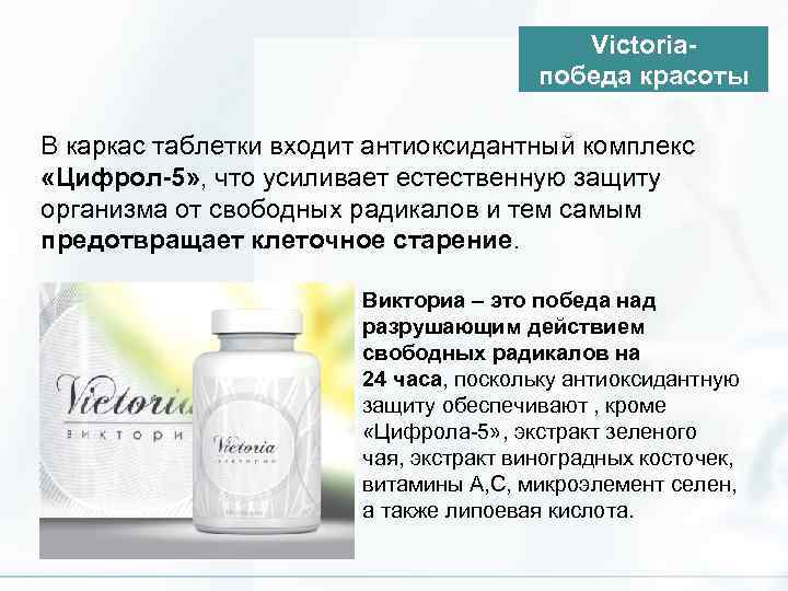 Victoriaпобеда красоты В каркас таблетки входит антиоксидантный комплекс «Цифрол-5» , что усиливает естественную защиту организма от свободных радикалов и тем самым предотвращает клеточное старение. Викториа – это победа над разрушающим действием свободных радикалов на 24 часа, поскольку антиоксидантную защиту обеспечивают , кроме «Цифрола-5» , экстракт зеленого чая, экстракт виноградных косточек, витамины А, С, микроэлемент селен, а также липоевая кислота.