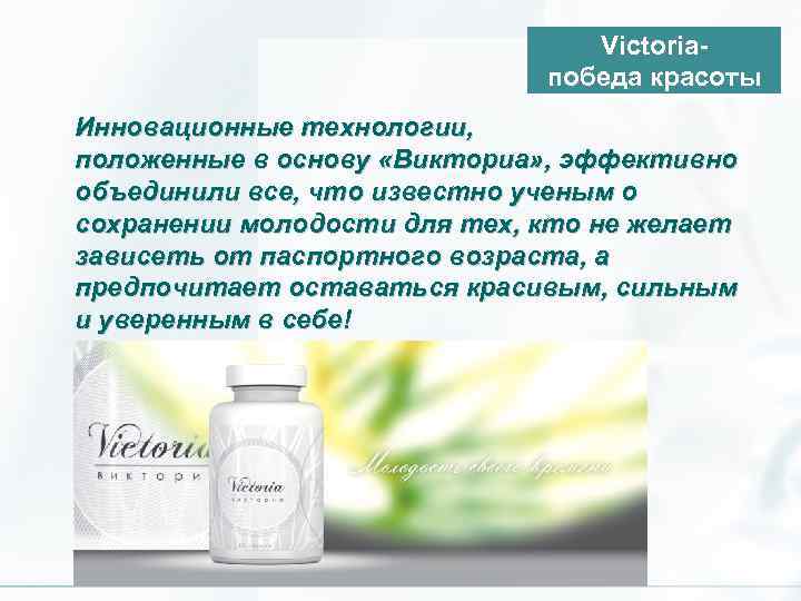 Victoriaпобеда красоты Инновационные технологии, положенные в основу «Викториа» , эффективно объединили все, что известно ученым о сохранении молодости для тех, кто не желает зависеть от паспортного возраста, а предпочитает оставаться красивым, сильным и уверенным в себе!