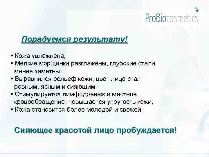 Порадуемся результату! • Кожа увлажнена; • Мелкие морщинки разглажены, глубокие стали менее заметны; • Выравнился рельеф кожи, цвет лица стал ровным, ясным и сияющим; • Стимулируется лимфодренаж и местное кровообращение, повышается упругость кожи; • Кожа становится более молодой и свежей; Сияющее красотой лицо пробуждается!