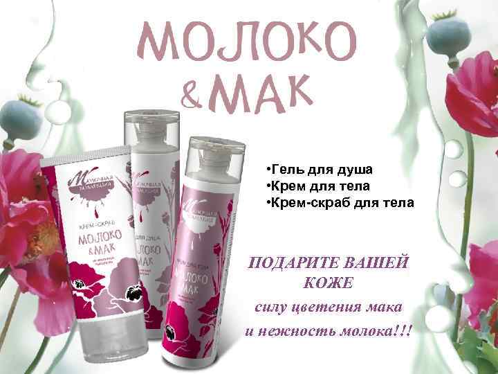 • Гель для душа • Крем для тела • Крем-скраб для тела ПОДАРИТЕ ВАШЕЙ КОЖЕ силу цветения мака и нежность молока!!!