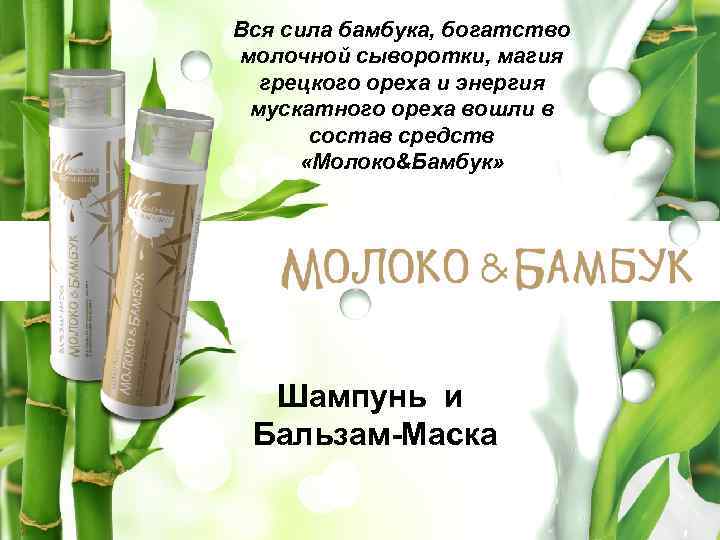 Вся сила бамбука, богатство молочной сыворотки, магия грецкого ореха и энергия мускатного ореха вошли в состав средств «Молоко&Бамбук» Шампунь и Бальзам-Маска