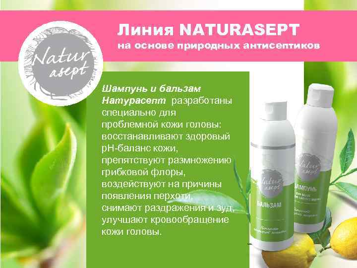 Линия NATURASEPT на основе природных антисептиков ЧЧЧЧ Ч Шампунь и бальзам Натурасепт разработаны специально для проблемной кожи головы: восстанавливают здоровый p. H-баланс кожи, препятствуют размножению грибковой флоры, воздействуют на причины появления перхоти, снимают раздражения и зуд, улучшают кровообращение кожи головы.