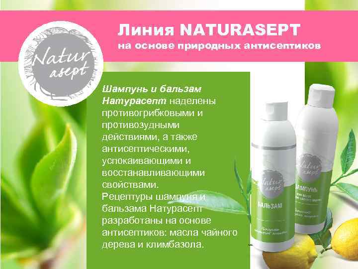 Линия NATURASEPT на основе природных антисептиков ЧЧЧЧ Ч Шампунь и бальзам Натурасепт наделены противогрибковыми и противозудными действиями, а также антисептическими, успокаивающими и восстанавливающими свойствами. Рецептуры шампуня и бальзама Натурасепт разработаны на основе антисептиков: масла чайного дерева и климбазола.