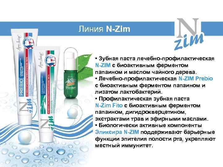 Линия N-Zim • Зубная паста лечебно-профилактическая N-ZIM с биоактивным ферментом папаином и маслом чайного дерева. • Лечебно-профилактическая N-ZIM Prebio с биоактивным ферментом папаином и лизатом лактобактерий. • Профилактическая зубная паста N-Zim Fito с биоактивным ферментом папаином, дигидрокверцетином, экстрактами трав и эфирными маслами. • Биологически активные компоненты Эликсира N-ZIM поддерживают барьерные функции эпителия полости рта, укрепляют местный иммунитет.