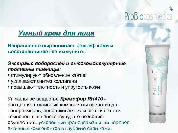 Умный крем для лица Направленно выравнивает рельеф кожи и восстанавливает ее иммунитет. Экстракт водорослей и высокомолекулярные протеины пшеницы: • стимулируют обновление клеток • усиливают синтез коллагена • повышают плотность и упругость кожи Уникальное вещество Кремофор RH 410 - расщепляет активные компоненты средства до наноразмеров, обволакивает их и заключает эти компоненты в нанокапсулу, что позволяет осуществить ускоренный трансдермальный перенос активных компонентов в глубокие слои кожи.