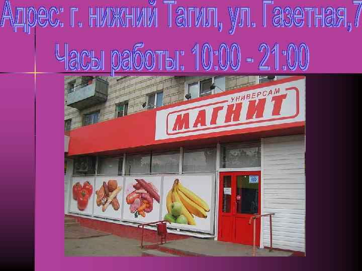 «Уважаемые покупатели в связи с открытием нового магазина сети «Магнит» ждем вас с нетерпением за покупками. Для Вас представлен весь необходимый ассортимент продукции. Только у нас самое высокое качество и низкие цены!!!!!» Ждем Вас по адресу: город Нижний Тагил Ул. Газетная, 7