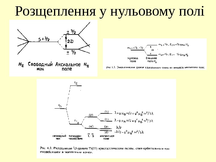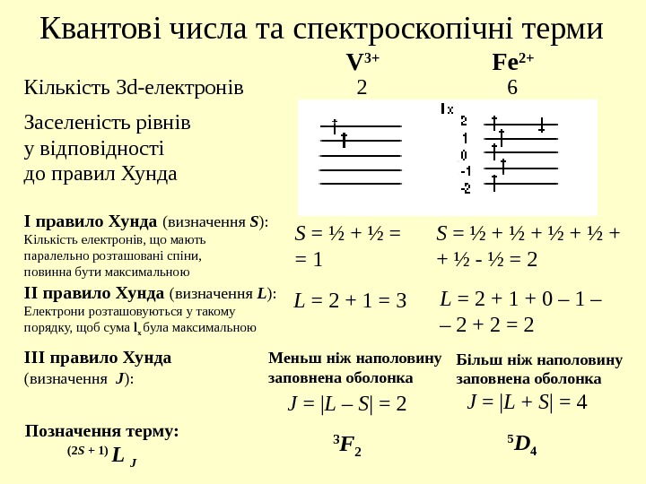 Квантові числа та спектроскопічні терми V 3+ Fe 2+ Кількість 3 d- електронів 2 6 Заселеність рівнів у відповідності до правил Хунда І правило Хунда (визначення S ) : Кількість електронів, що мають паралельно розташовані спіни, повинна бути максимальною S = ½ + ½ = = 1 S = ½ + ½ + + ½ — ½ = 2 ІІ правило Хунда (визначення L ) : Електрони розташовуються у такому порядку, щоб сума l x була максимальною L = 2 + 1 = 3 L = 2 + 1 + 0 – 1 – – 2 + 2 = 2 III правило Хунда (визначення J ): Меньш ніж наполовину заповнена оболонка Більш ніж наполовину заповнена оболонка J = | L – S | = 2 J = | L + S | = 4 Позначення терму: (2 S + 1) L J