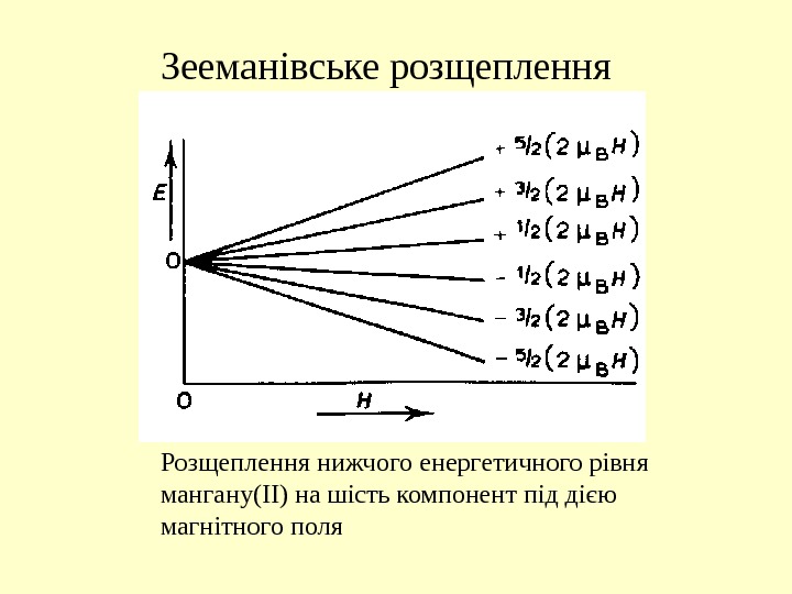 Зееманівське розщеплення Розщеплення нижчого енергетичного рівня мангану(ІІ) на шість компонент під дією магнітного поля