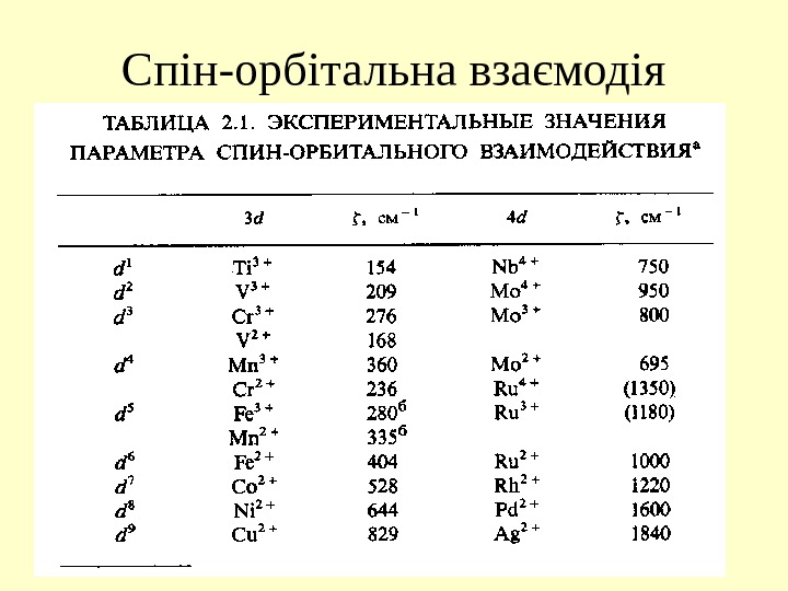 Значення констант спін-орбітальної взаємодії для вільних іонів (см -1 ) Ti(III) V(III) Cr(III) Mn(III) Fe(II) Co(II) Ni(II) Cu(II)