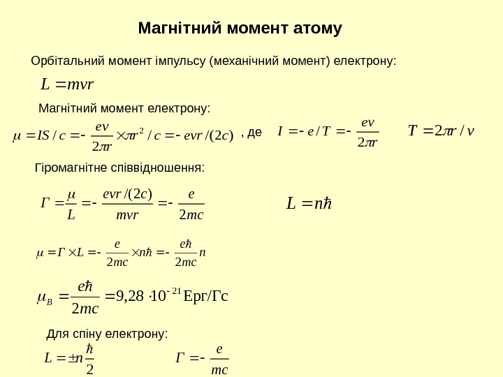 Магнітний момент атому Орбітальний момент імпульсу (механічний момент) електрону: )2/(/ 2 /2 cevrcr r ev c. IS mvr. L r ev Te. I 2 / Магнітний момент електрону: , деvr. T/2 mc e mvr cevr LΓ 2)2/( n mc e LΓ 22 Ерг/Гс1028, 9 2 21 mce B n. L Гіромагнітне співвідношення: Для спіну електрону: 2 n. L mc e Γ