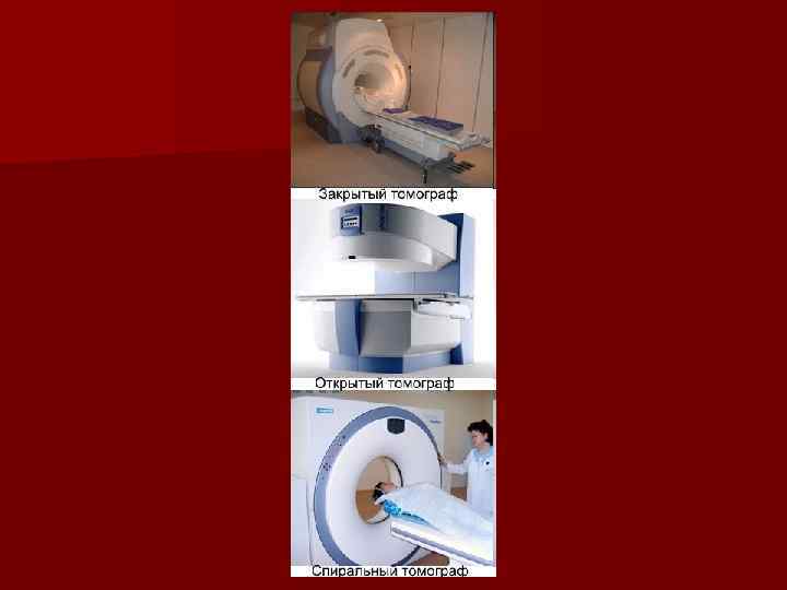 Типы МРТ томографов МРТ томограф может быть открытым и закрытым. В закрытом МРТ, пространство ограничено, пациент лежит в как закрытом туннеле. Открытый МРТ используется у пациентов, которые не переносят замкнутого пространства (клаустрофобия), у детей и у больных в тяжелом состоянии, за которыми нужно постоянное наблюдение. Открытые томографы отличаются от закрытых систем по многим параметрам. Для МРТ-томографов большая сила напряженности магнитного поля недостижима на открытых системах (на сегодня закрытые магнитно-резонансные томографы имеют силу поля равной 3 Тесла, для открытых систем планка установлена на уровне 1 Тесла). Современные МРТ томографы с мощностью до 1 Тесла, как правило, имеют специальные математические программы, повышающие качество снимков до 1 -1. 5 Тесла. Томографы с мощностью более 1. 5 Тесла, используются для научных исследований и не имеют преимуществ перед 1. 5 «Тесловыми» томографами. Врачи получили возможность проводить хирургические операции и биопсии одновременно видя МР-изображения области вмешательства