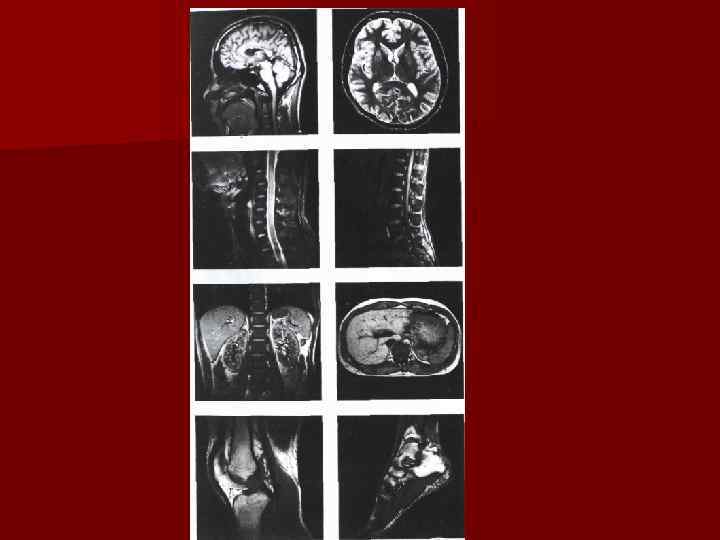 Различные ткани (серое и белое вещество головного мозга, спинномозговая жидкость, опухолевая ткань, хрящ, мышцы и т. д. ) имеют в своем составе протоны с разным временем релаксации T 1. С продолжительностью T 1 связана величина МР сигнала: чем короче T 1, тем сильнее МР сигнал и тем светлее выглядит данное место изображения на телемониторе. Жировая ткань на МР томограммах белая, вслед за ней идут головной и спинной мозг, плотные внутренние органы, сосудистые стенки и мышцы. Воздух, кости и кальцификаты практически не дают МР сигнала и поэтому отображаются черным цветом. В свою очередь мозговая ткань также имеет неоднородное время Т 1 у белого вещества оно иное, чем у серого. T 1 опухолевой ткани отличается от T 1 одноименной нормальной ткани. Указанные взаимоотношения времени релаксации T 1 создают предпосылки для визуализации нормальных и измененных тканей на МР томограммах. При другом способе МР томографии, названном спин эховым, на пациента направляют серию радиочастотных сигналов, поворачивающих прецессирующие протоны на 90°. Вслед за прекращением импульсов регистрируют ответные МР сигналы. Однако интенсивность ответного сигнала по иному связана с продолжительностью Т 2: чем короче Т 2, тем слабее сигнал и, следовательно, ниже яркость свечения экрана телемонитора. Таким образом, итоговая картина МРТ по способу Т 2 противоположна МРТ по способу T 1 (как негатив позитиву).