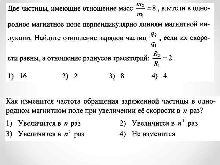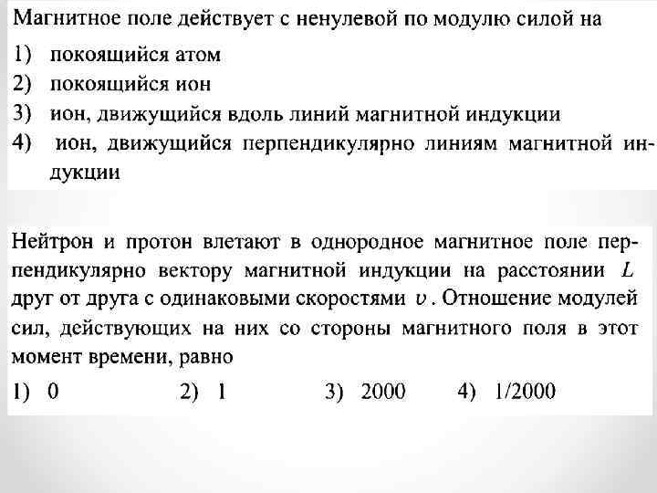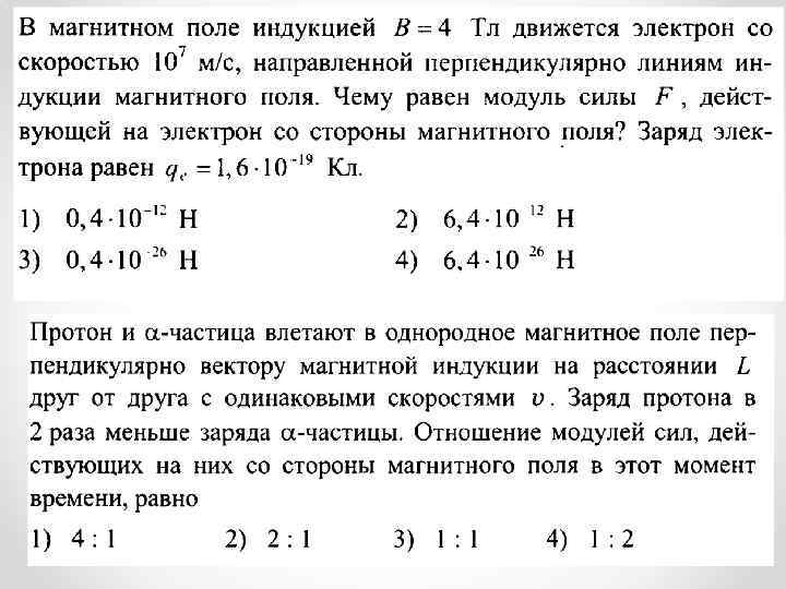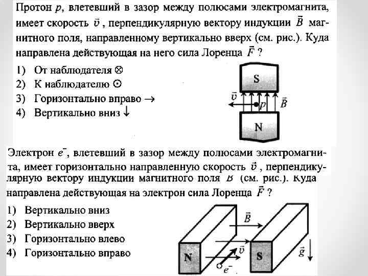 1 вариант 1) Определите направление силы Лоренца N S 2)Определите направление вектора v магнитной индукции : v + Fл 3)Определите направление скорости движения заряда Fл x x x x x+ x x В 4) С какой скоростью движется в однородном поле с магнитной индукцией 0, 01 Тл протон, если он описывает окружность радиусом 10 см? 2 вариант 1) Определите направление силы Лоренца N + v S 2)Определите направление вектора магнитной индукции : - v Fл (к нам) 3)Определите направление скорости движения заряда • • В • • + • • • Fл 4) Электрон, двигаясь со скоростью 108 см/с, влетает в однородное магнитное поле с индукцией 20 м. Тл. Каков будет радиус кривизны его траектории?