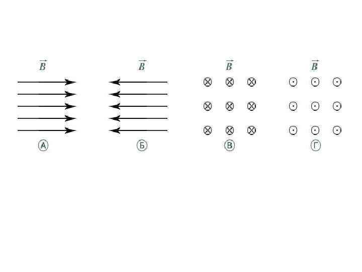 Линии магнитной индукции Магнитные стрелки можно заменить железными опилками, которые намагничиваются в поле данного магнита и становятся маленькими стрелками. (На картон, который кладут на магнит, насыпают опилки. При легком потряхивании картона опилки хорошо ориентируются. ) Поле, в каждой точке которого вектор магнитной индукции постоянен по величине и направлению, называют однородным. На рисунке приведены способы изображения силовых линий однородного магнитного поля, направленного вправо (а), влево (б), в плоскость листа от нас (в) и из него к нам (г).