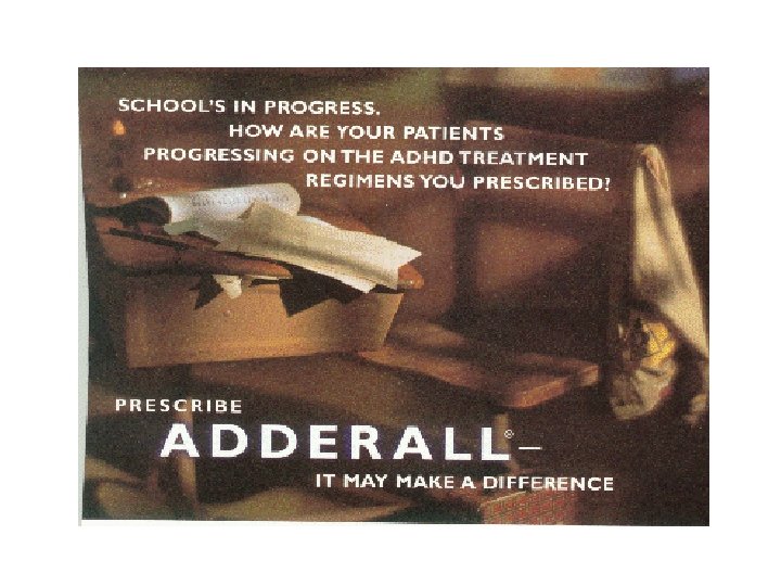 Attention Deficit Disorder n n n Hyperactivity and the “paradox” Amphetamine (Adderall) Methylphenidate (Ritalin, Concerta) 10 million + prescriptions per year 700% increase between ’ 92 & ‘ 04