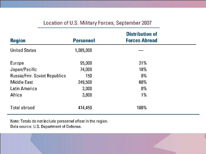 The Foreign Policy and Defense Agenda Foreign Policy and Defense Bureaucracy • Department of State o Staffing the Diplomatic System • National Security Council • Intelligence Community o 15 agencies o Central Intelligence Agency • Department of Defense o Joint Chiefs of Staff The Pentagon - headquarters of the U. S. DOD and employs about 23, 000 military and civilian personnel.