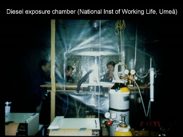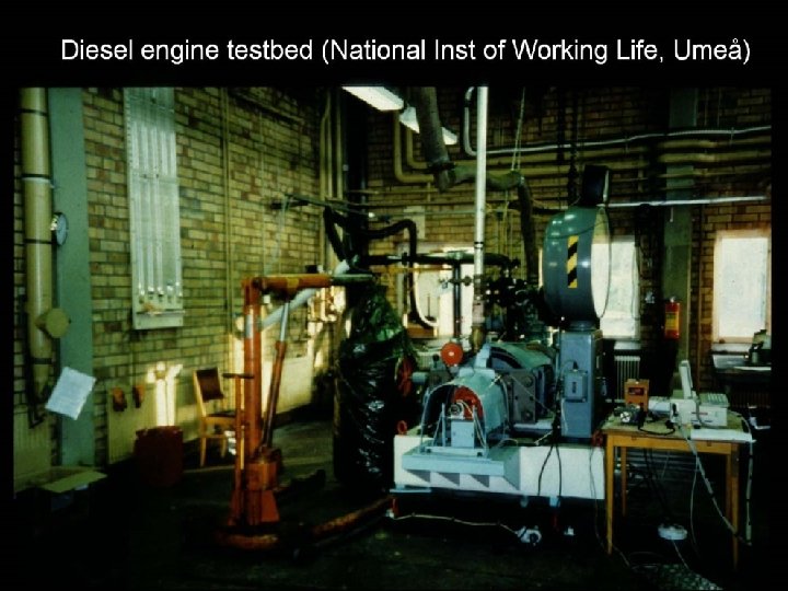Methods • Diesel exhaust was generated from an idling Volvo engine (built 1993), diluted with filtered ambient air and pumped into an exposure chamber in the next room. • On control days the engine was left running but only filtered air was supplied to the chamber • Particulate and gas concentrations were measured on a continuous basis