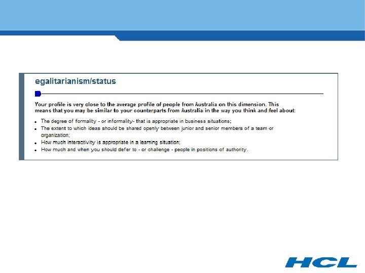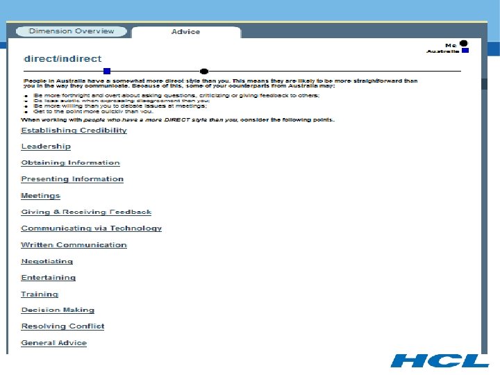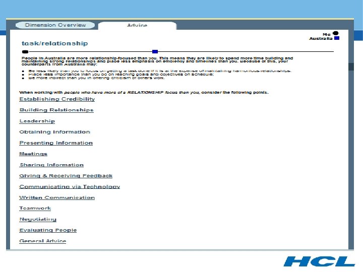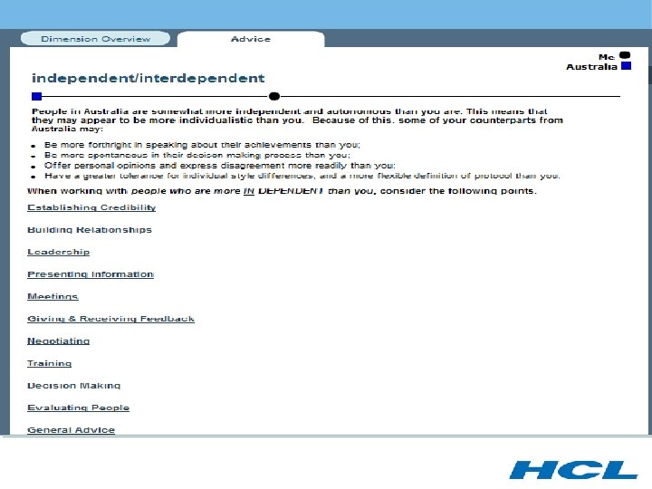 Getting Started with Globe Smart § What is this tool? This tool equips an individual to understand his/ her own cultural orientation. § How is this tool different from any other? This tool is comprehensive as well as gives a subjective input in case one would want to look at it at a glance. A detailed report is important to bridge the gaps in all parameters. The parameters spoken about, are standard parameters in all cultural orientations. § What is in it for me, as an individual? You as an individual will be able to gauge where you stand in your personal cultural orientation and thus know how well you understand your customers and your international peers. § What is in it for my project and my account? This tool enables you not only to understand your own cultural orientation but also helps you understand your team and your account’s/ project’s cultural orientation at large. This is possible, only after your entire team has undertaken the self assessment and informed the SPOC assigned. § What is in it for HCL as an organisation? Given the understanding that every organisation is made up of employees from all spectrum & that as an organisation, are a global organisation, we need to have a tool that equips us to be sensitized enough and enables us working across borders.