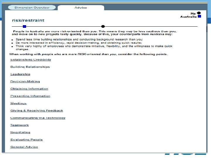 Globe Smart • Sample Comparison of my culture profile with the avg culture profile of USA. • We can click on “Get Advice” and understand better what the map means