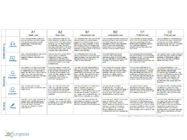 The Europass Language Passport (ELP) • Summarises the holder’s linguistic identity, language learning achievements and intercultural experiences. • Includes the holder’s self-assessment of his/her own language competence. • Done according to the Common European Framework of Reference for Languages.