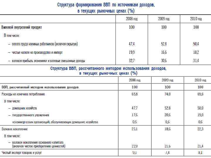 Структура ВВП по источникам доходов (в процентах к ВВП) 1995 1996 1998 1999 2000 2001 2004 2005 2006 2010 100, 0 100, 0 100, 0 45, 4 51, 0 48, 1 40, 2 43, 0 46, 0 43, 8 44, 1 50, 4 чистые налоги на производство и импорт 11. 9 14, 2 16, 0 15, 7 17, 1 15, 7 16, 8 19, 7 20, 0 18, 2 валовая прибыль экономики и валовые смешанные доходы 34, 8 35, 9 44, 2 42, 7 41, 3 37, 2 36, 5 35, 9 31, 4 Валовой внутренний продукт в том числе: оплата труда наемных работников (включая скрытую) 42, 7