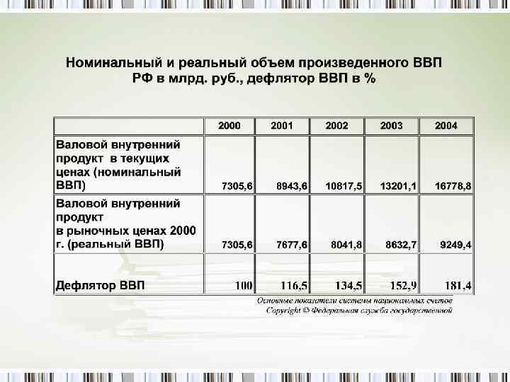 Уровень цен Из принципа расчета валового продукта в рыночных ценах следует, что величина этого показателя зависит от изменения 2 факторов: 1. от реального объема продукта 2. от уровня цен ВВП рассчитанный в текущих ценах, в ценах данного года - номинальный ВВП Для того, чтобы исключить влияние изменения цен, валовой продукт рассчитывают в базовых ценах (в ценах выбранного базового года, например, 1913, 1991, 2000 ) ВВП , рассчитанный в базовых ценах, называется реальный ВВП