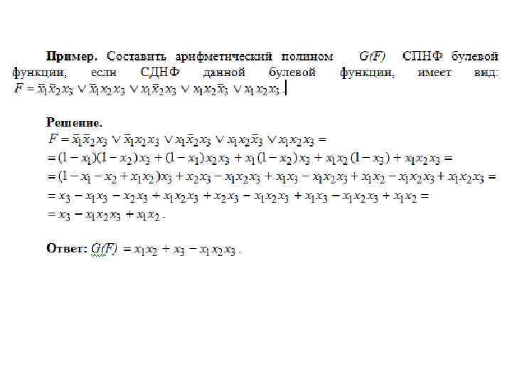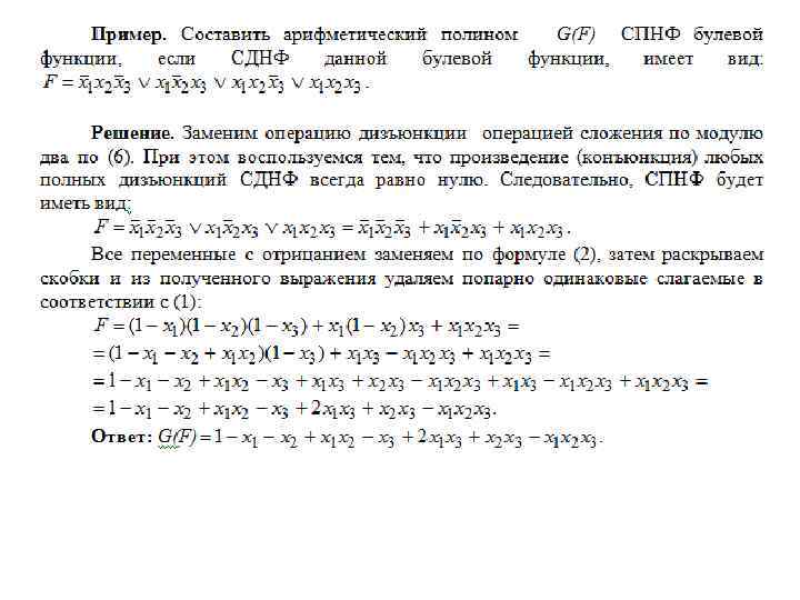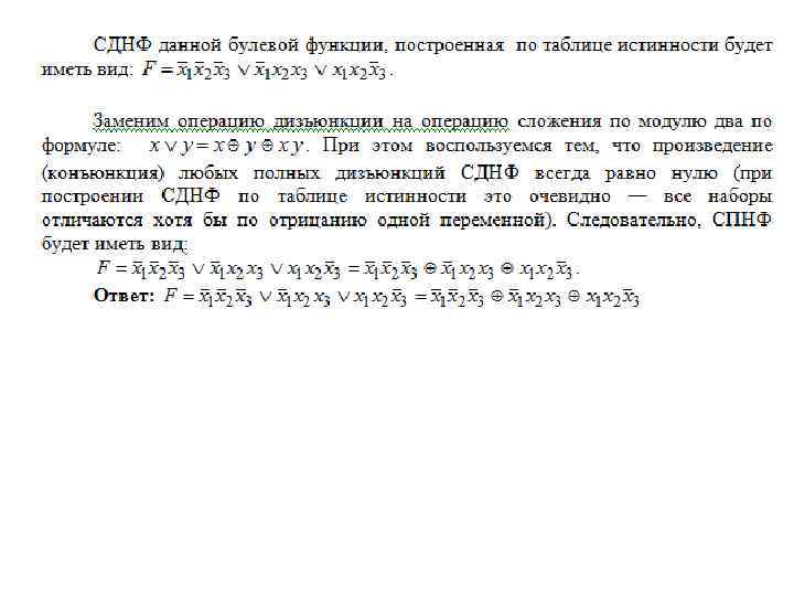 Определение. Полином функции F, состоящий только из полных элементар ных конъюнкций, называется совершенной ПНФ (СПНФ). По аналогии с СДНФ такое представление конкретной булевой функции F явля ется единственным. Рассмотрим на примерах построение СПНФ, используя преобразование СДНФ булевой функции.